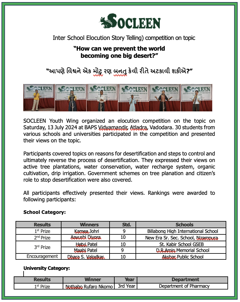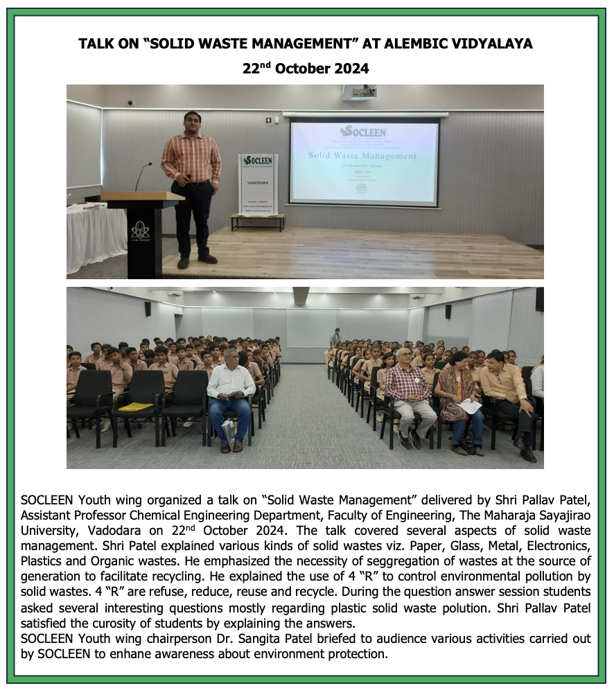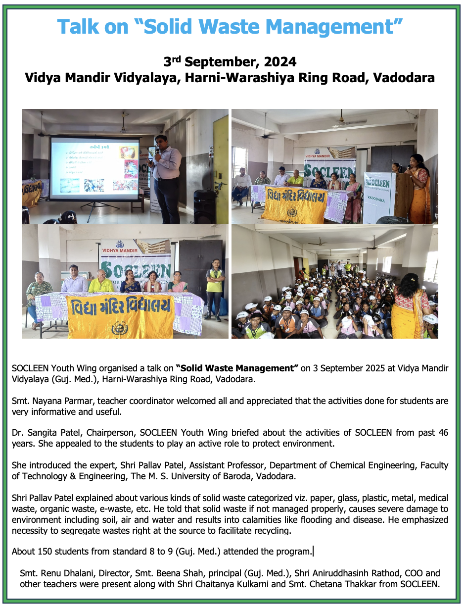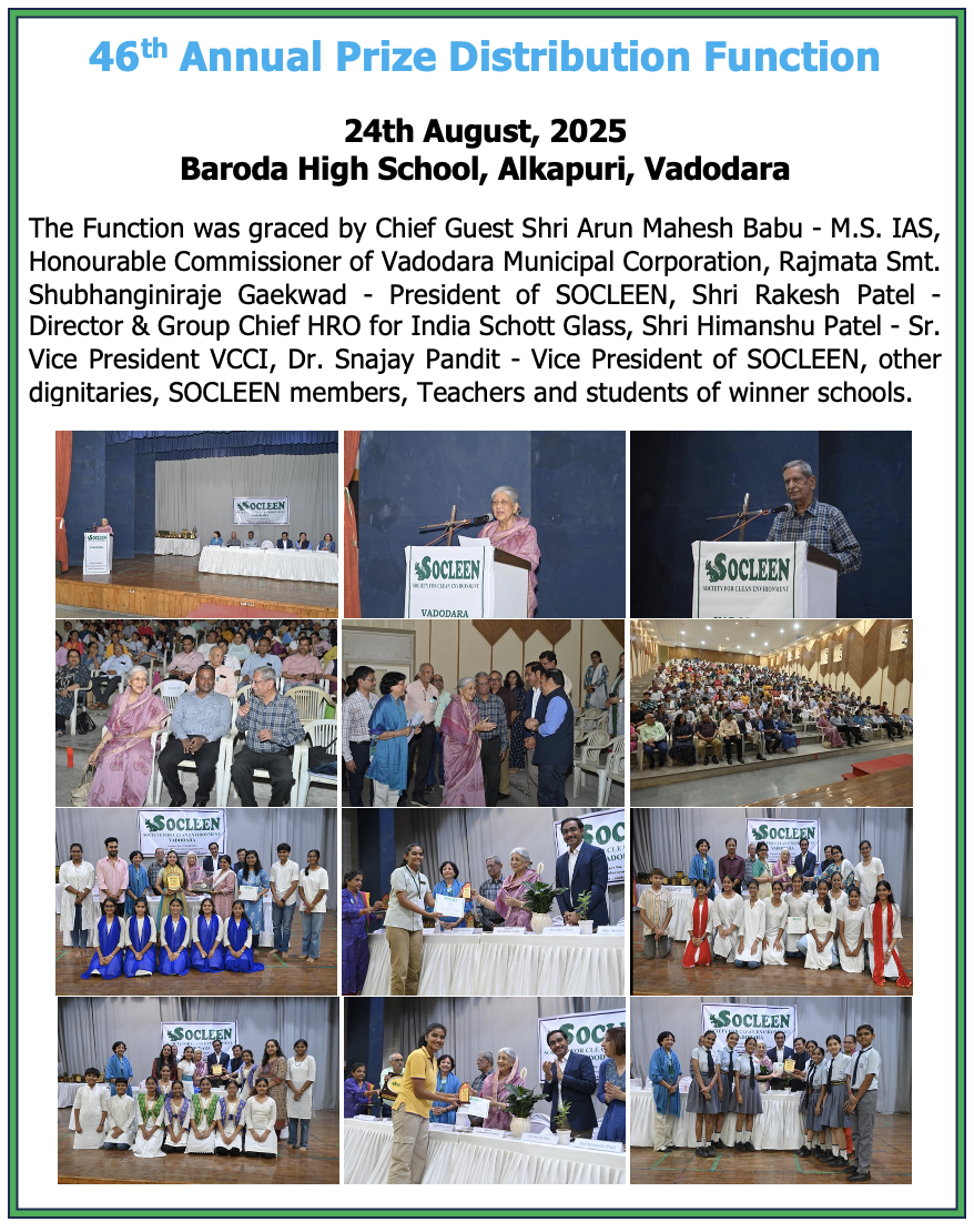 SOCLEEN is a voluntary, non-profit and non-political organization committed to creating cleaner, greener and pollution free environment in and around Vadodara. Deeply concerned about the threat of ever increasing pollution to our environment, we at SOCLEEN strongly believe in interdependence of science, technology, industry, government and voluntary efforts of each and every citizen. When all stakeholders work together, their concerted efforts not only can save our environment from further degradation but also can help restore some of the lost resources. We create public awareness on environmental issues and stimulate positive action; and suggest measures to mitigate environmental degradation and to promote a sustainable healthy eco-system in Vadodara.