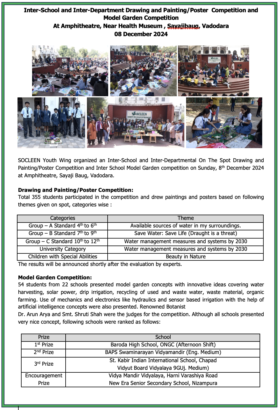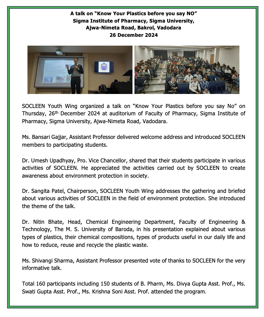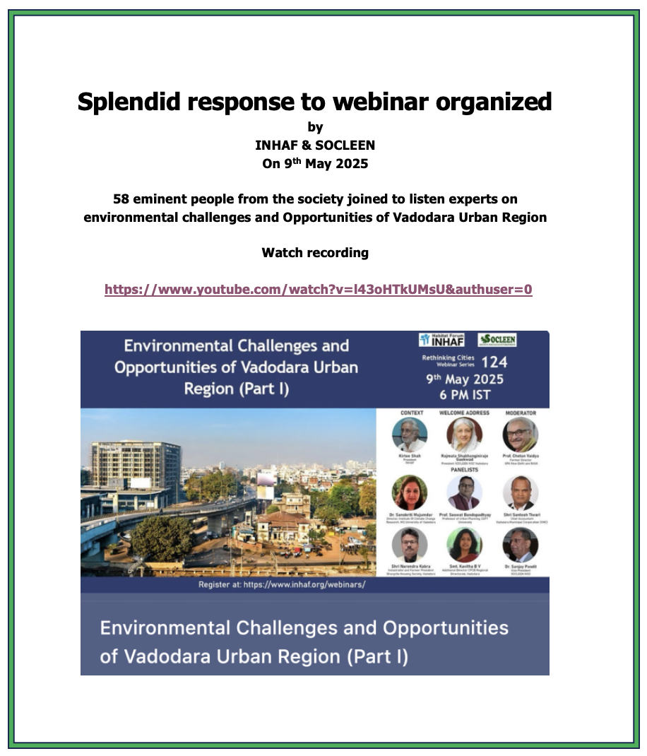 SOCLEEN is a voluntary, non-profit and non-political organization committed to creating cleaner, greener and pollution free environment in and around Vadodara. Deeply concerned about the threat of ever increasing pollution to our environment, we at SOCLEEN strongly believe in interdependence of science, technology, industry, government and voluntary efforts of each and every citizen. When all stakeholders work together, their concerted efforts not only can save our environment from further degradation but also can help restore some of the lost resources. We create public awareness on environmental issues and stimulate positive action; and suggest measures to mitigate environmental degradation and to promote a sustainable healthy eco-system in Vadodara.